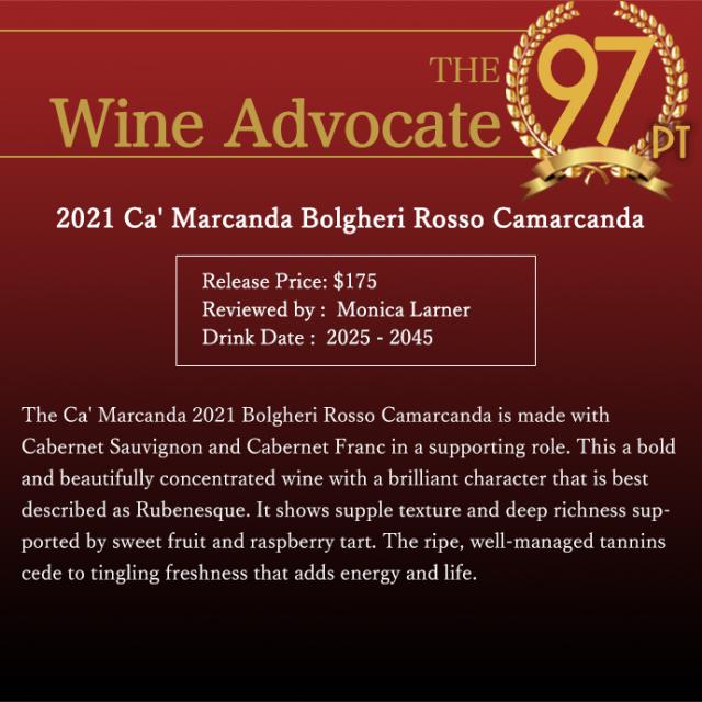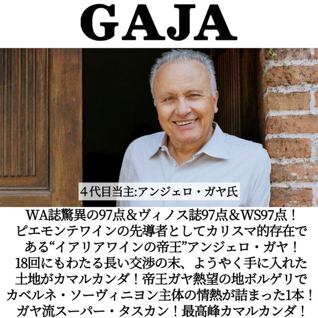 WA誌驚異の97点&ヴィノス誌97点&WS97点!ピエモンテワインの先導者としてカリスマ的存在で ある“イアリアワインの帝王”アンジェロ・ガヤ!18回にもわたる長い交渉の末、ようやく手に入れた土地がカマルカンダ!帝王ガヤ熱望の地ボルゲリでカベルネ・ソーヴィニヨン主体の情熱が詰まった1本! ガヤ流スーパー・タスカン!最高峰カマルカンダ!