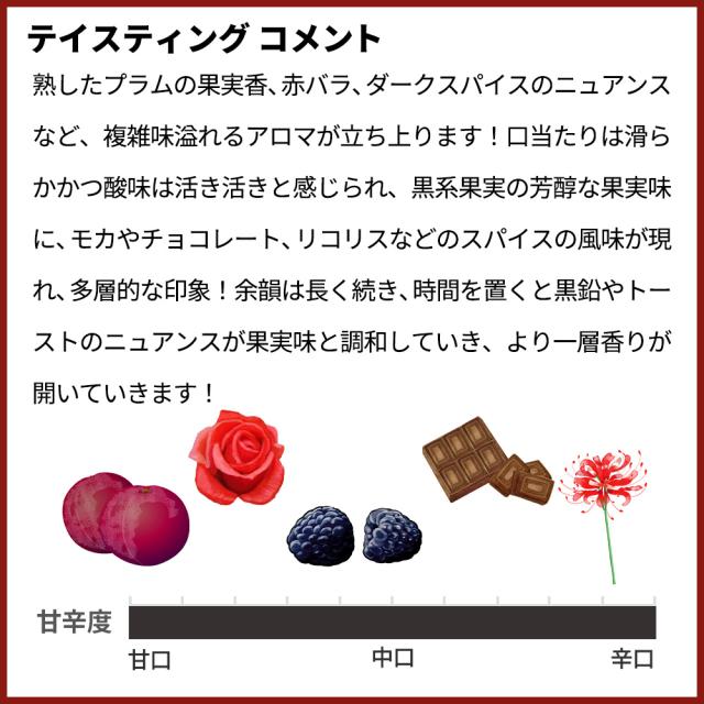 ![]() ■ぶどう品種:カベルネ・ソーヴィニヨン主体にカベルネ・フラン 外観は、深みのあるルビーレッドの色調!グラスからは、熟したプラムの果実香、赤バラ、ダークスパイスのニュアンスなど、複雑味溢れるアロマが立ち上ります!口当たりは滑らかかつ酸味は活き活きと感じられ、黒系果実の芳醇な果実味に、モカやチョコレート、リコリスなどのスパイスの風味が現れ、多層的な印象!余韻は長く続き、時間を置くと黒鉛やトーストのニュアンスが果実味と調和していき、より一層香りが開いていきます! 熟成ポテンシャルに優れていることから、今後の味わいの発展が楽しみな1本!市場でも非常に入手困難な最高峰カマルカンダが限定で少量入荷! ![]() ![]() |