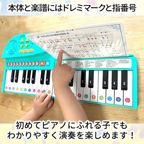 本体とカードタイプの楽譜には、ドレミマークと指番号が記載され、初めてピアノにふれる子どもでもわかりやすく演奏を楽しむことができます。