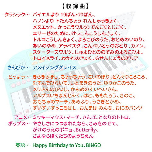 バイエルより 19ばん・20ばん、ハノンより トたんちょう れんしゅうきょく、メヌエット、 かっこうワルツ、てんごくとじごく、エリーゼのために、けっこんこうしんきょく、トルコこうしんきょく、よろこびのうた、おとめのいのり、あいのゆめ、アラベスク、こんぺいとうのおどり、カノン、スケーターズワルツ、しゅよひとののぞみのよろこびよ、トロイメライ、わかれのきょく、Gせんじょうのアリア