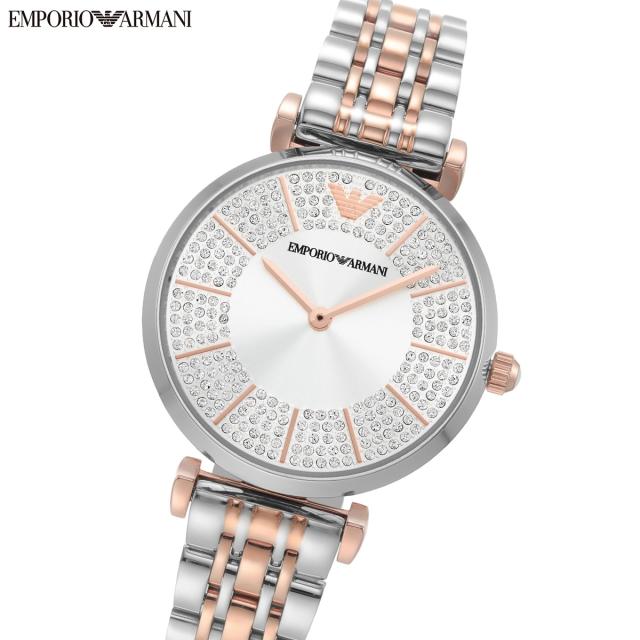 ステンレススチールを使用した32mm径ケースに、二針ムーブメントを搭載したEmporio Armaniウォッチ。光沢のあるシルバートーンのサンレイダイヤルにツートーンのステンレススチールブレスレットを組み合わせました。【エンポリオ アルマーニ EMPORIO ARMANI】