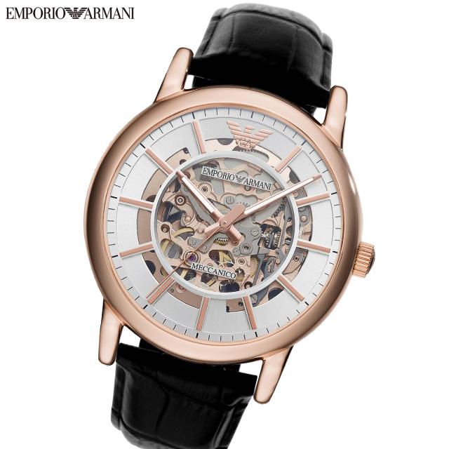 Emporio Armaniのスタイリッシュなメンズウォッチ。艶出しローズゴールドトーンのケース、シルバーのサンレイスケルトンダイヤル、ポップなローズゴールドトーンIPのメッキを施した内部ムーブメント、ブラックのレザーストラップが特徴です。【エンポリオ アルマーニ EMPORIO ARMANI】