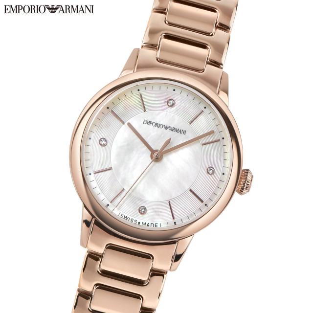 28mm径ケースに三針ムーブメントを搭載したEmporio Armaniのウォッチ。ローズゴールドトーンのグリッツバーインデックスを配した光沢のあるホワイトマザーオブパールのダイヤルに、ローズゴールドトーンのステンレススチール製ブレスレットを組み合わせました。【エンポリオ アルマーニ EMPORIO ARMANI】