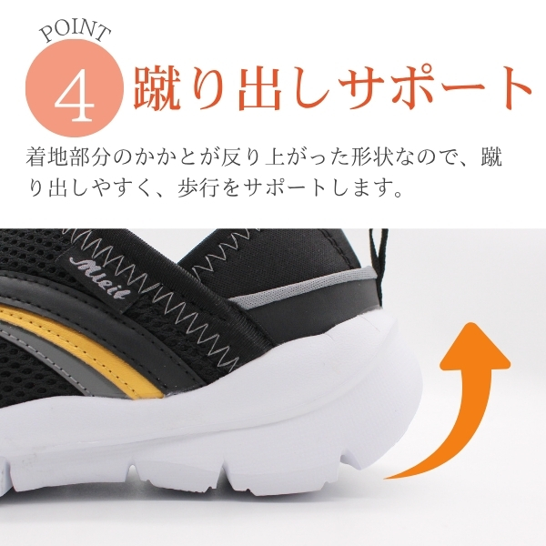 着地部分のかかとが反り上がった形状なので、蹴り出しやすく、歩行をサポートします。