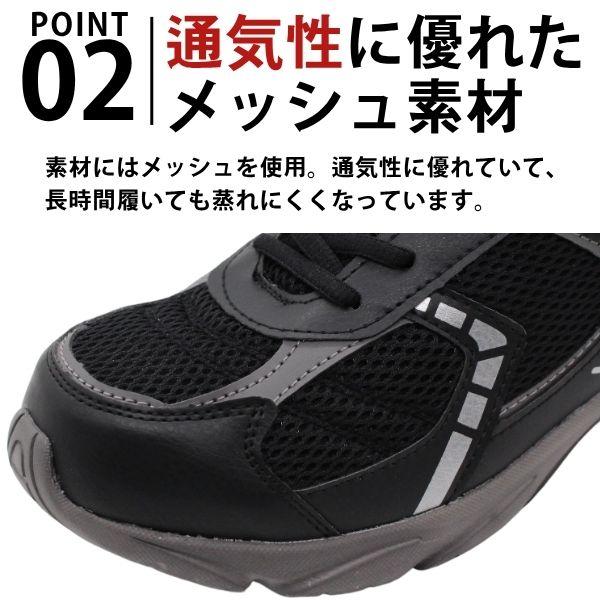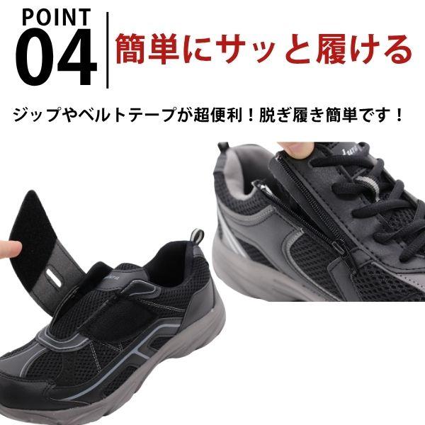 片足約230gとりんご1つ分くらいの軽さ。足の負担が少なく、長時間履いても疲れません。素材はメッシュを使用。通気性に優れているので長時間履いても蒸れることはありません。3E相当の幅広設計で足先に余裕を持って履けます。足幅が広い方でも快適にお履きいただけます。ジップやベルトテープなので脱ぎ履きが簡単にできます。