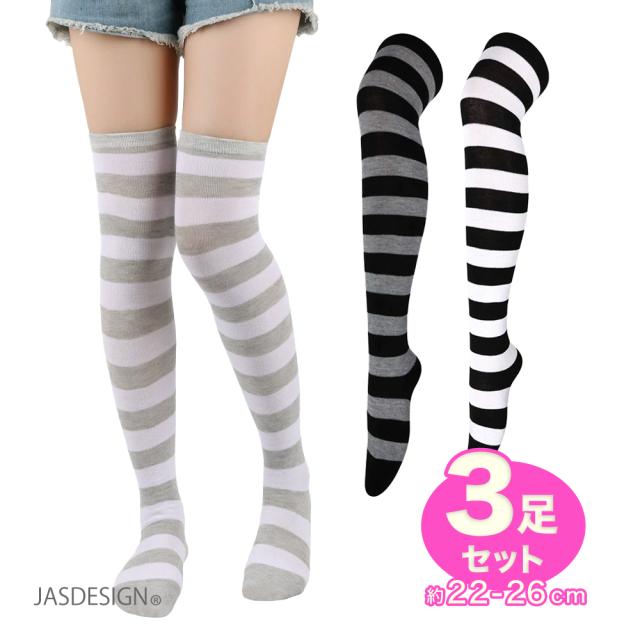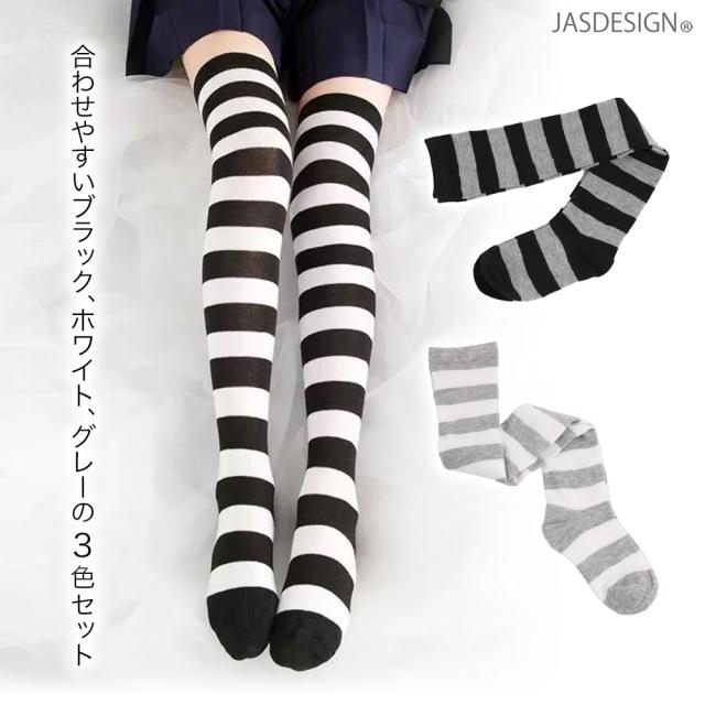 ニーハイソックス ボーダー 3色セット ブラック ホワイト グレー ニーハイ ソックス レディース 女の子 子供 黒 白 灰 タイツ コスチューム 衣裳 セクシー かわいい 美脚 ダンス 舞台 ハロウィン コスプレ 送料無料 JM-410
