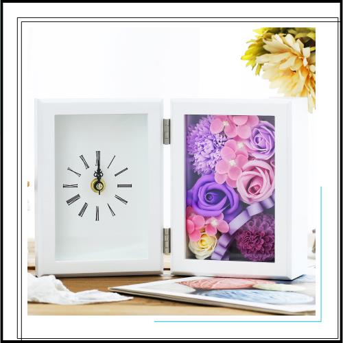 ちょうどいいサイズ:フレームサイズ(開いた時):横(約24cm)×縦(約16.7cm)/素材・材質:フレーム/MDF(中質繊維板)、パネル部分/ガラス 花材/ソープフラワー(バラ、カーネーション、紫陽花など)、リボン/綿WEISHY 母の日のプレゼント ソープフラワー 時計 誕生日プレゼント 女性 造花 ギフト結婚祝い 卒業祝い 枯れない花 置き時計 還暦祝い 退