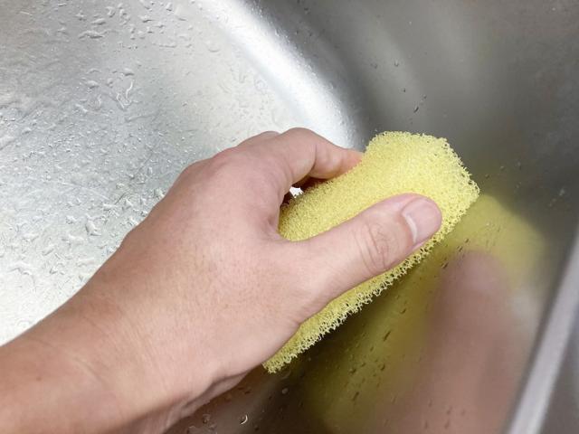 キズをつけずにしっかり洗えるシンク洗いスポンジ。硬いスポンジなので、こびりつき汚れはしっかりとカキとり、対象物にはキズをつけずに洗うことができる。ゴシゴシと洗ってもへたりにくく、耐久性にも優れている。