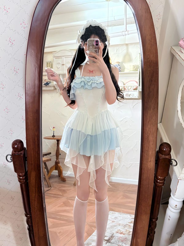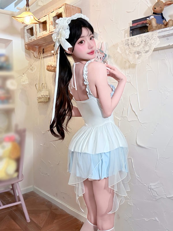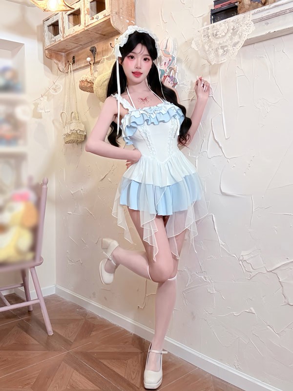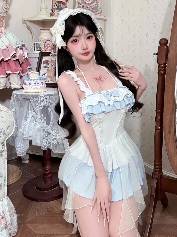 ワンピース水着 レディース ロリータ風 フリル かわいい 透け感あり リボン 水着 肩出し 着痩せ 学生 シンプル セクシー 無地 コスプレ 衣装 海 リゾート 旅行 撮影 写真用 映える 温泉 プール ビーチ ホワイト ブルー S M L XL 2XL mg862m4m4m5