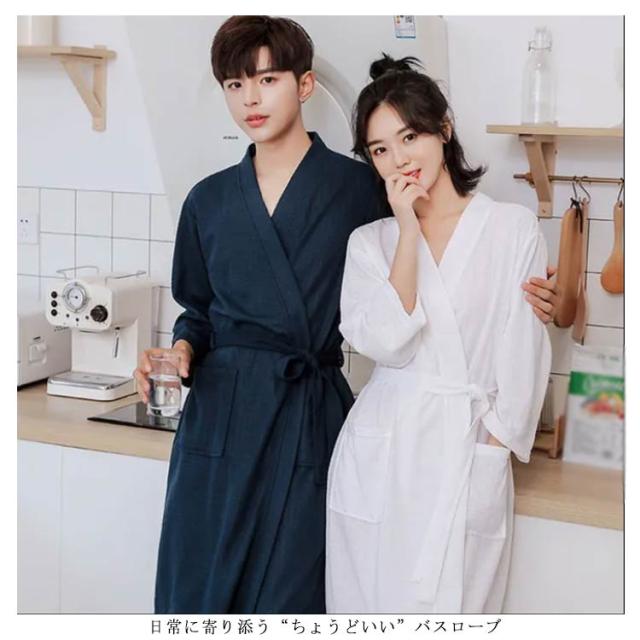 | ナチュラルな風合いがステキ!男女兼用なバスローブ登場! 日常に寄り添う“ちょうどいい”バスローブ バスリエ的に目指したのは、日常に寄り添うバスローブ=毎日使いにちょうどいいバスローブ。 しっかりとした吸水性もありながら 軽い・コンパクト・速乾を実現。 薄めのベースと長めのパイルで、厚すぎず薄すぎずちょうどいい厚み。 厚すぎないから着ていても重くないし、濡れても乾きが早い パイル地で吸水性もあるのに肌触りがサラッとしていて、洗濯後は乾きやすい 普段使いでガシガシ洗えて気を使わない気軽さがある。 軽やかさのあるこの厚みだから、忙しいお風呂上がりにサッと着れます?。 サッと着られるバスローブのベースは薄め、だからバスローブを着た時のズッシリ感がない。 だからこのバスローブは毎日着たくなる、日常着寄りのバスローブなんです。 | |