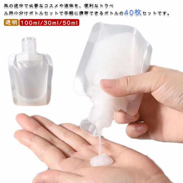 40枚入り トラベルボトル 50ml 詰め替えボトル パウチ 容器 スパウトパウチ 30ml ふた付 透明 旅行用 液体容器 100ml シャンプー ドリンクパック 持ち運び 詰め替え容器 小分け パウチ容器 シャンプーボトル 小分けボトル 化粧水 乳液 化粧品詰替え 漏れ防止