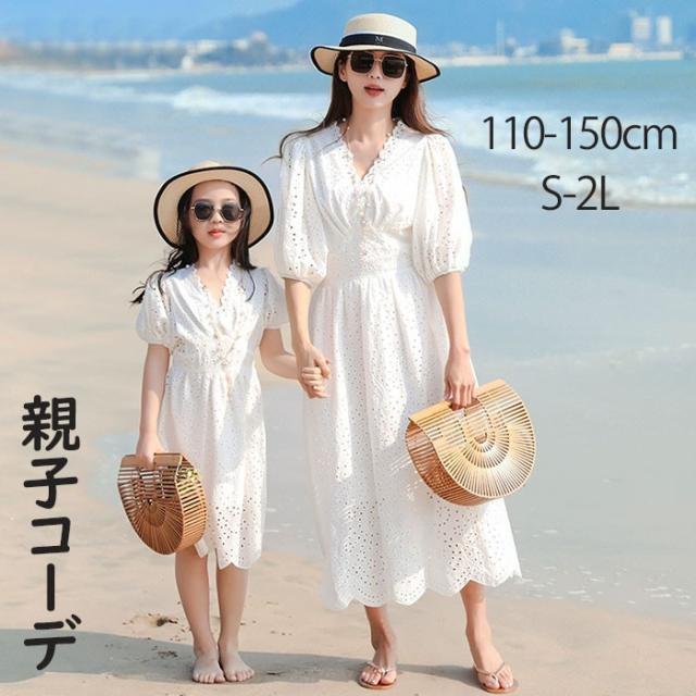 親子コーデ ワンピース レディース 白ワンピース 子供ワンピース オシャレ フリル ホワイト 白 シアー感 無地ワンピ ママ 母 キッズ 親子 シンプル 韓国 かわいい 旅行 海デート リゾート 沖縄 夏ワンピ 白ワンピース 子供 キッズ 110 120 130 140 150 S M L 2L