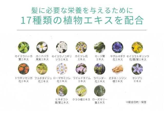 ・17種類の植物エキスを配合 セイヨウハッカ葉エキス、カニナバラ果実エキス、セイヨウノコギリソウ、カミツレ花エキス、ヤグルマギク花エキス、セイヨウオトギリソウ、トウキンセンカ花エキス、フユボダイジュ花エキス、ローマカミツレ花エキス、ワイルドタイム、ラベンダー、オタネニンジン、センブリエキス、ヒキオコシ葉、クララ根エキス、ローズマリー葉エキス |