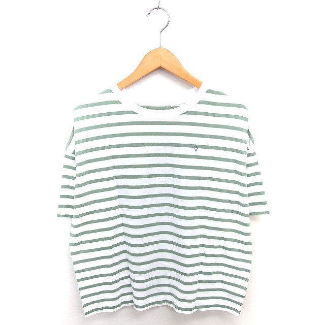 【中古】ハートマーケット Heart market Tシャツ カットソー ボートネック ボーダー 刺繍 半袖 F ホワイト グリーン