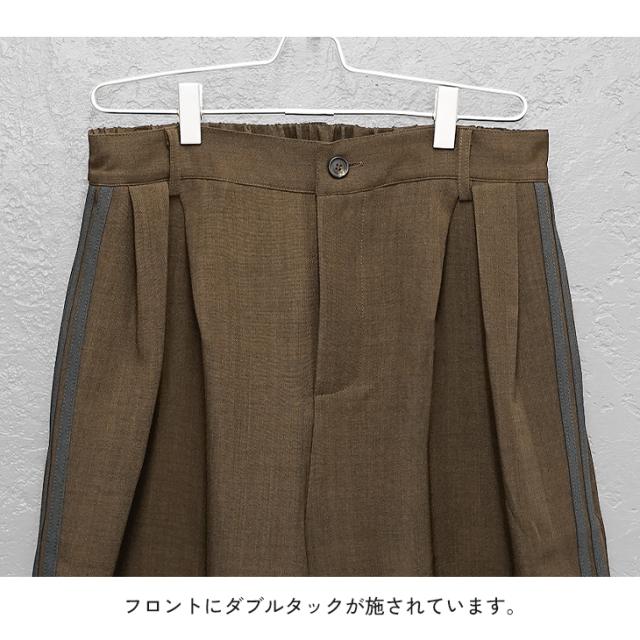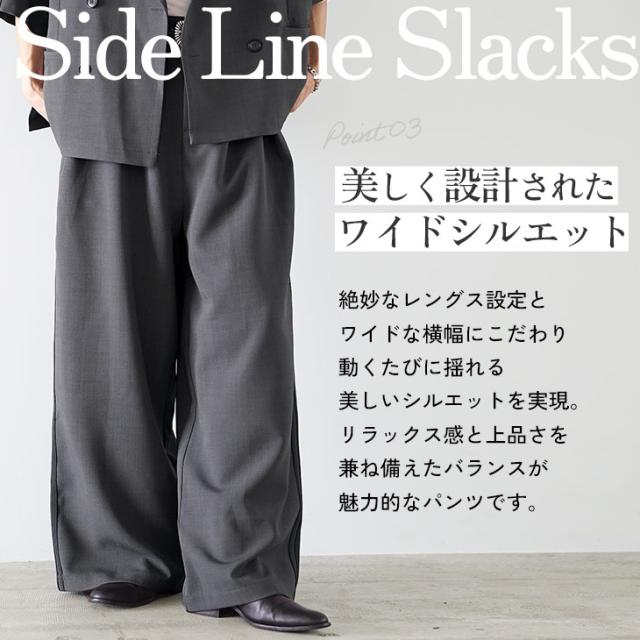 サイドのラインデザインとジャケットの深いサイドスリット、さらにボトムスのタックが作り出す立体感が印象的なセットアップ。