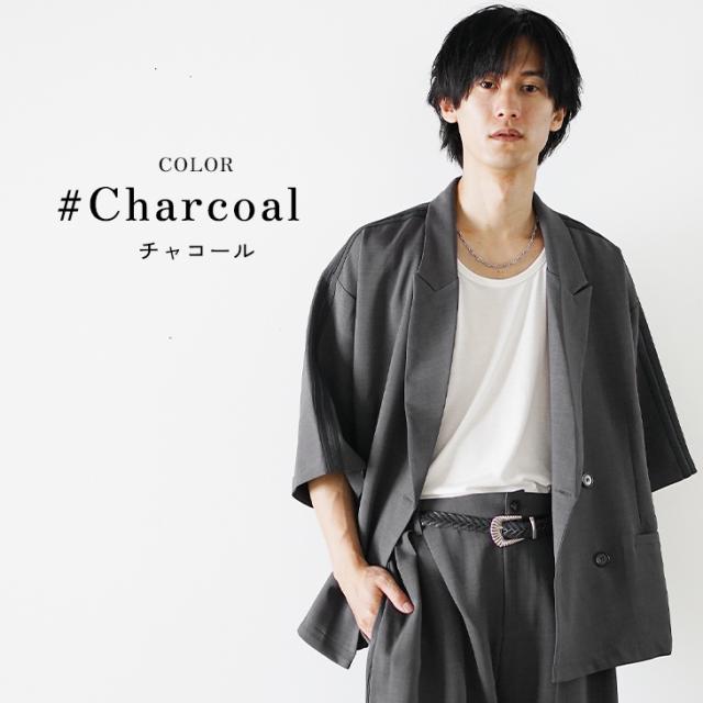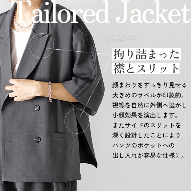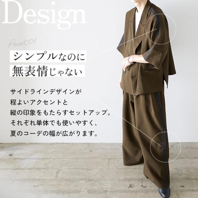 サイドのラインデザインとジャケットの深いサイドスリット、さらにボトムスのタックが作り出す立体感が印象的なセットアップ。ジャケットとスラックスというきれいめな印象のセットアップながらも、ゆったりとしたサイズ感にすることで、かっちりとし過ぎずカジュアルな印象に。上品さとリラックス感を兼ね備えた一着持っておきたい半袖のセットアップです。