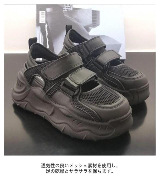 | モードにも甘めにもマッチする意外と万能な厚底スニーカーサンダル。 ボリュームのある厚底ソールで背長効果も期待できます。 通気性の良いメッシュ素材を使用し、足の乾燥とサラサラを保ちます。 履くだけで細見え抜群の美脚にシフト。 だから無条件で可愛い&スタイルアップが叶います。 厚みのあるグリップ力に優れた防滑ソールで悪天候時も安心。 マジックテープ式で着脱ぎも簡単。 楽ちんフィットの厚底がひとつあれば、デイリー履きでも頼りになります。 | |