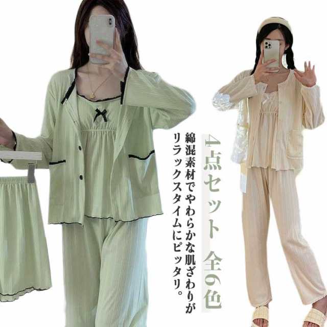 ルームウェア 女性 ロングパンツ 4点セット カップ付き パジャマ カーディガン 夏 ナイトウェア 寝間着 ショートパンツ ルームウェア キャミソール レース リボン 可愛い かわいい 春 部屋着 上下セット セットアップ 寝巻 リブ
