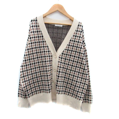 【中古】グローバルワーク GLOBAL WORK ニットカーディガン Vネック ミドル丈 千鳥格子柄 F マルチカラー ベージュ
