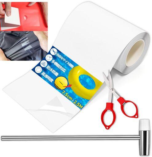 防水テープ ビニール補修用テープ 強力補修テープ 浮き輪修理 プール 補修テープ TPUテープ テント補修テープ 縫い目 穴修理 漏れ防止 粘着性 防水性7.5CM×2.5M ハサミ、ハンマー付き