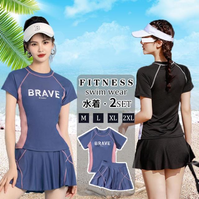 水着 レディース 体型カバー フィットネス水着 韓国風 ママ水着 胸パッド付きおしゃれ かわいい 女性用 2点セット 小胸 盛れる 黒 スクール水着 運動用