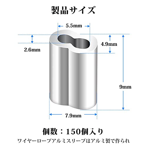 ワイヤーロー プスリーブ 2mm 150個パック アルミ製ワイヤーロープ固定スリーブ オーバル形状 圧着機対応 アルミニウム合金 クランプ用具 ケーブルクリンプリング 8字型デザイン ハンドプレス対応 送料無料