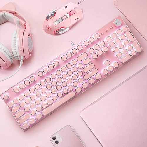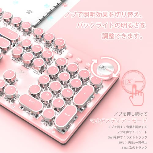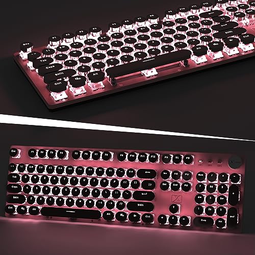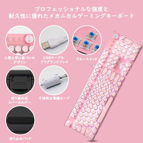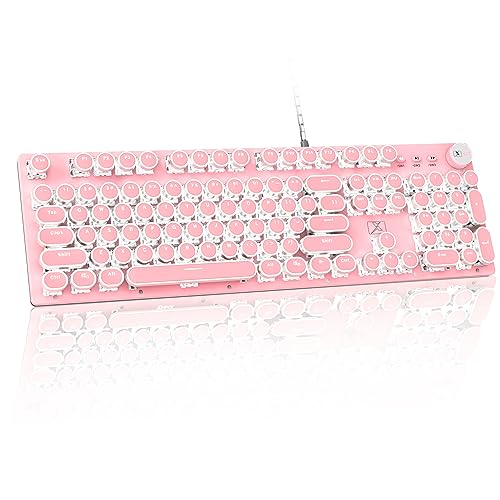 有線パンクキーボード メカニカルキーボードノブ付き レトロなラウンドキーキャップ タイプライター 青軸 104キー フルキーアンチゴースト 白色LED 25種類のバックライトモード USB有線コンピュータキーボード Windows XP / 7 / 8 / 10 / 11 / Mac OS対応 (ピンク)