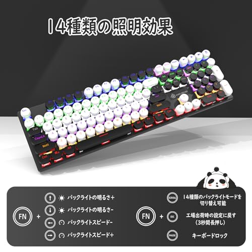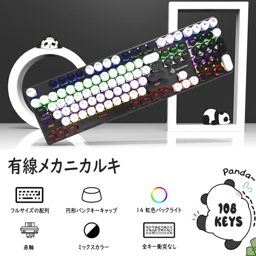 有線パンクキーボード メカニカルキーボードノブ付き レトロなラウンドキーキャップ タイプライター 赤軸 108キー フルキーアンチゴースト 白色LED 25種類のバックライトモード USB有線コンピュータキーボード Windows XP / 7 / 8 / 10 / 11 / Mac OS対応 (ブラック)
