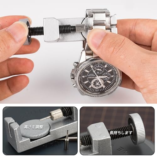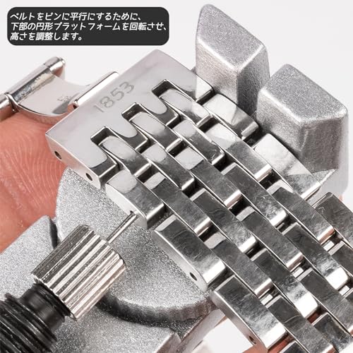 簡単に使える - この時計ベルト調整キットは、異なる厚さの時計ベルトを正確に修理することができます。ベルトをピンに平行にするために、下部の円形プラットフォームを回転させ、高さを調整します。そして、ピンを押し出すためにサイドのホイールを回します。ほとんどの時計リンクには「矢印」のサインがあり、取り外し位置を示しています。