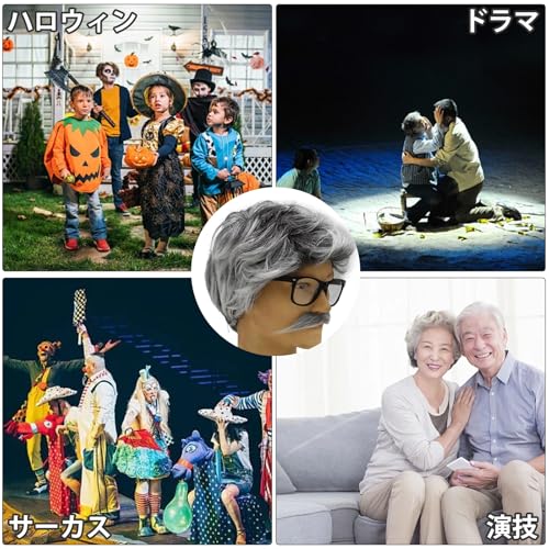 メンズウィッグ 3点セット 老人ウィッグ 口ひげとメガネ ハロウィン コスチューム 大人 おじいちゃん かつら キッド おじいちゃん 教授 コスプレ