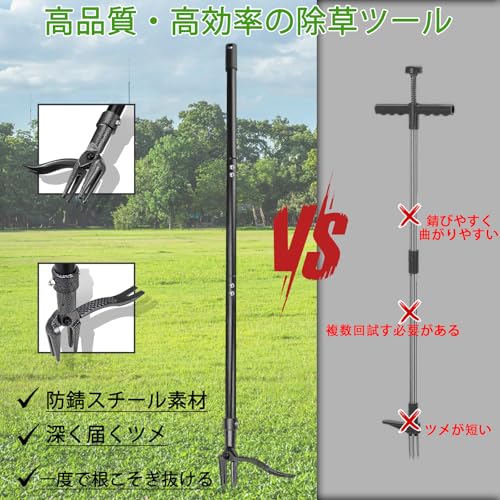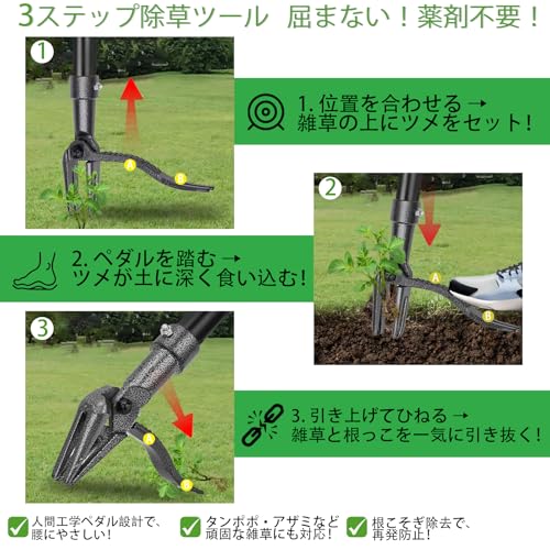【多機能草抜き道具・草地の覇者】 進化したスタンドアップ草取り道具の登場!雑草抜きのプロフェッショナル道具がさらに使いやすくなりました!立ったまま使用できる雑草取り道具は、大庭や野原など広いエリアで大活躍。頑固な雑草にも対応し、効率的な作業をサポートします。花壇やガーデンなど、様々なシーンでご利用いただけます。草むしりをもっと快適にする便利グッズです。