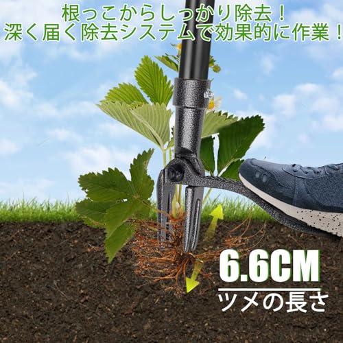 【4本爪で根こそぎ除草!頑固雑草対応】 私たちの雑草取り器具は、改良された4爪デザインが、雑草の根をしっかり掴んで引き抜きます。手動のスタンドアップ草刈り道具は、てこの原理を利用して、力を節約しながら頑固な雑草も根こそぎ除去できます。根からしっかりと取り除くことで