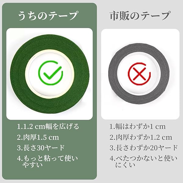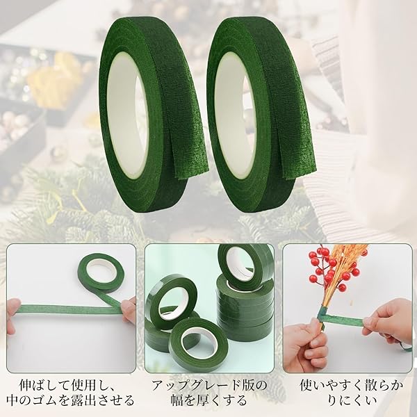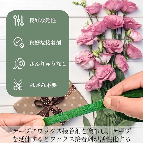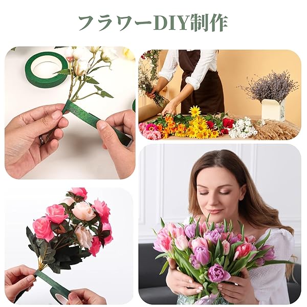 【高品質の素材】フローラルテープは、優れたクレープ紙を使用したフローラルテープで、滑らかで柔らかい質感が特徴です。よく伸び、包みやすくて、引き裂きや切断もしやすい。造花や花束の製作に最適な濃い緑色のテープです。