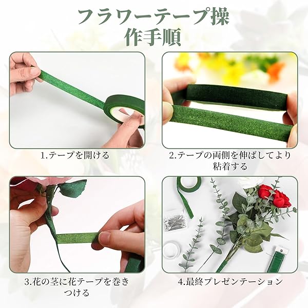 【使用方法】選んだフローラルテープを少し伸ばしてから、ブーケや造花に巻き付けるだけ。最後に余分な部分を切り取ることで、アクセサリーや花飾りの完成度がアップします。(脱落しないように最後にテープも少し伸ばして粘着性を高めることにご注意ください)