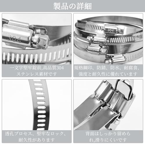 【高品質304ステンレス素材】ホースバンドは高品質304ステンレス素材を採用し、防錆、防水、耐腐食、強度と耐久性に優れ、硬度が高く、厳しい屋外環境でも長時間使用できます。