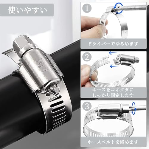 【使いやすい】当社のホースバンドは使いやすく、ドライバーでホースバンドのネジを緩めたり締めたりするだけで、サイズを調整でき、ホースをコネクタにしっかり固定できます。製品に素早く簡単に取り付けられます。 優れた密閉性を発揮し、ホースの液体やガス漏れの問題を効果的に解決します。
