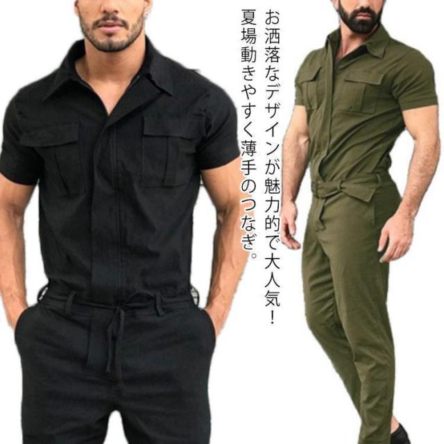 つなぎ メンズ ショートスリーブ カバーオール オールインワン 作業服 半袖 作業着 ロングパンツ 涼しい 半袖 夏 着痩せ ストリート ア