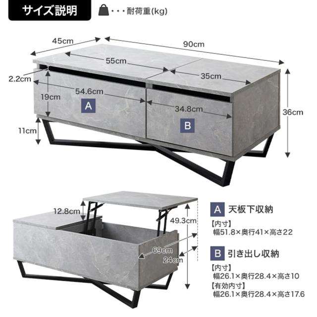 耐荷重: 昇降天板:約20kg(昇降時:約8kg)、固定天板:約20kg、天板下収納:約15kg