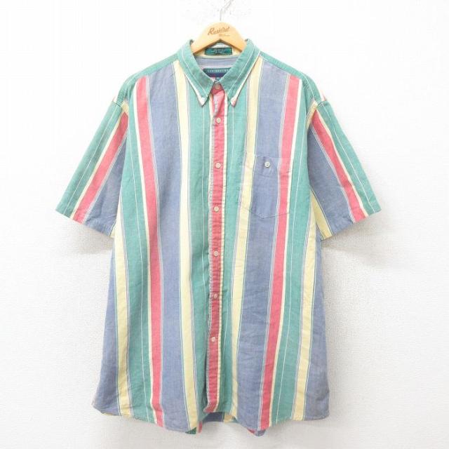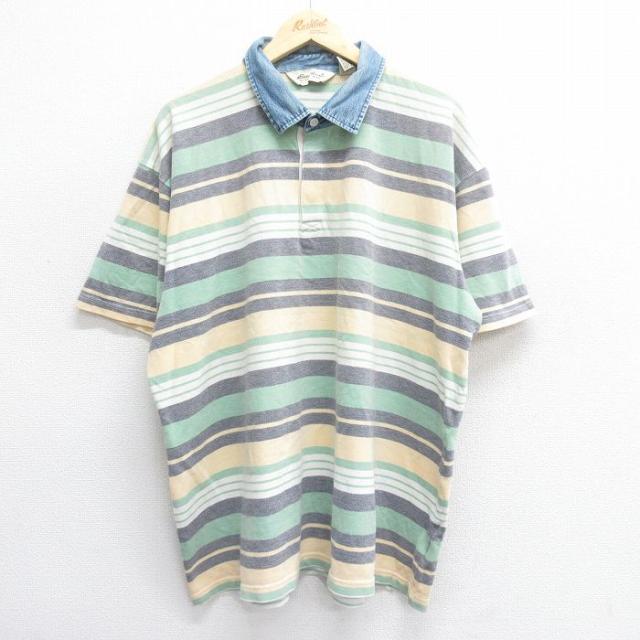 【商品名】 XL★古着 アメリカンイーグル American Eagle 半袖 ラガー シャツ メンズ 90年代 90s 襟デニム 大きいサイズ コットン 緑他 ボーダー【spe】