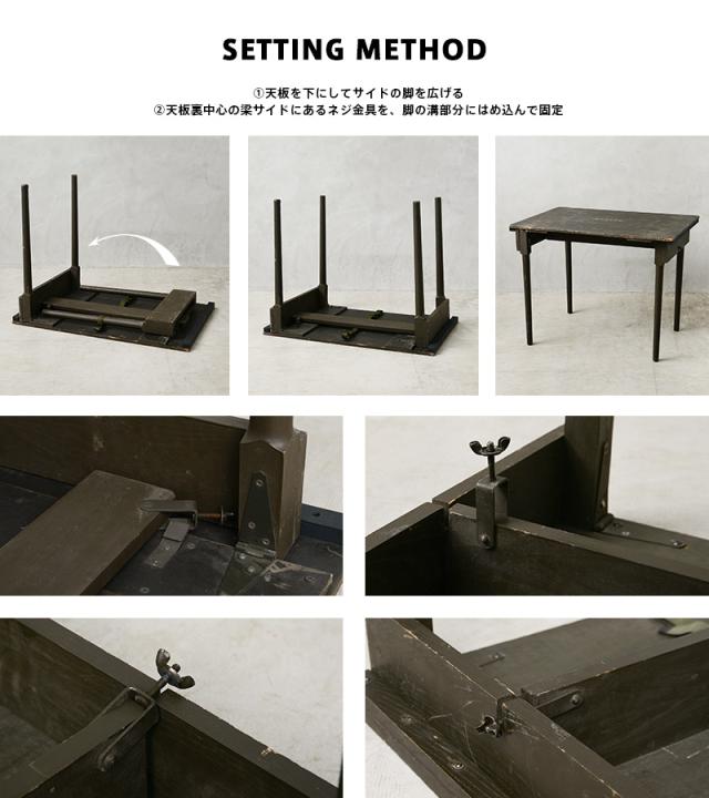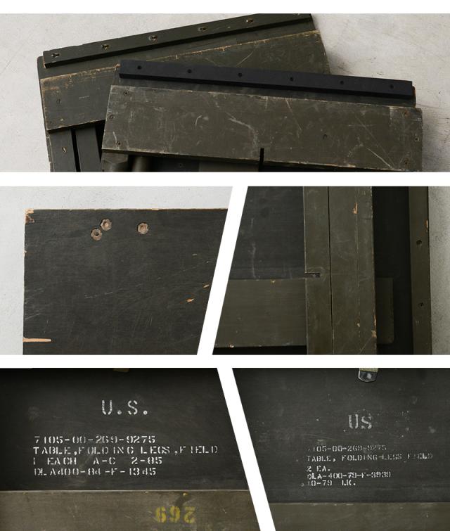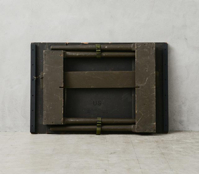 米陸軍がフィールドで使用する折り畳み可能なウッドテーブルです。OD色の丈夫なプライウッドの天板とウッドのフレームで作られており、使い込んだ雰囲気が抜群のアイテム。足をコンパクトに折り畳み、場所を取らず収納や持ち運びにも便利な仕様になっています。シンプルな構造ながらしっかりと安定性のある造りで、重厚さを感じる見た目に反して無理なく運べるサイズ感と重さ。お部屋やガレージでの使用は勿論、インテリアとしてお店の什器として取り入れるだけでインダストリアルやビンテージの本格的な雰囲気を味わうことが出来ます。