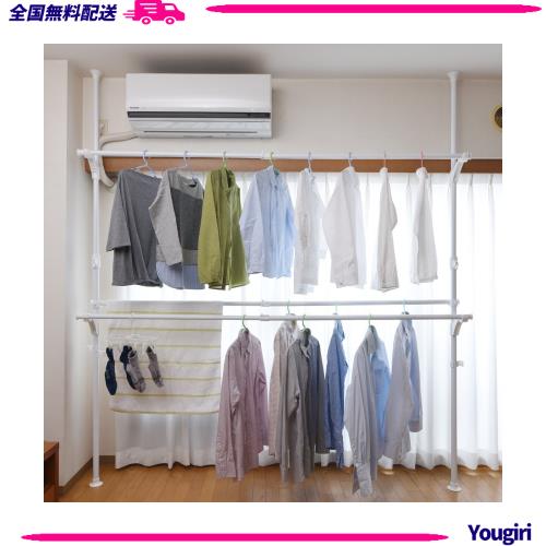●日当たりの良い窓際でも、エアコン下でも、壁面にも、設置場所を柔軟に決められる突っ張り固定式の室内物干し ●最大幅210cmまで広がりたっぷり掛けられる ●上下2段、合わせて約100着収納(3本掛けで最大150着)※紳士物シャツでの目安 ●下段の二連掛けは風通しも確保できるので布団干しとしても活躍。合計30kgまで対応 ●ボタンを押して上げるだけ、支柱は超カンタンなオリジナル突っ張り機構 ●洗濯物の上げ下げをサポートする引っかけ棒付属 ●使わない時はバーを支柱に固定でき、お部屋をスッキリ見せられる ●組立品(組立時間:約10-20分