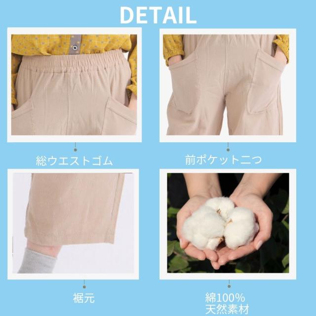 ■サイズ Mサイズウエスト60 (最大94)ヒップ120 股上25股下60.0わたり(太もも)33 裾幅18Lサイズウエスト64(最大100)ヒップ120 股上25股下60.0わたり(太もも)33 裾幅18LLサイズウエスト68(最大106)ヒップ120 股上27股下60.0わたり(太もも)33 裾幅18単位(cm)※商品によって2‐3cm程度の誤差がある場合がございますので、予めご了承ください。※平置きにて採寸しております■カラー ベージュ・ブラック・グレー■素材(生地・毛糸) 綿・コットン 100%■柄 無地凹凸感ある生地感■洗濯表示 家庭洗濯■シーズン 春 夏■パンツ脚幅 ワイド■商品説明 綿100% 丈直し不要サイズ!最高の涼しさコクーンパンツ!生地も柔らかく、天然素材 綿100%だからこそ涼しく履き心地快適!コクーンパンツは裾に向かって曲線を描くラインでスッキリとしスタイルUP!お尻回りや太ももゆったりしていて履きやすく、身体のラインを拾わず体型カバーにもなります。ウエストゴムで身体を締め付けず着脱も簡単ストレスフリーズボン。前ポケット2つ付きで、携帯もすっぽり入って便利なポケット■注意 モニター発色の具合により色合いが異なる場合がございます。