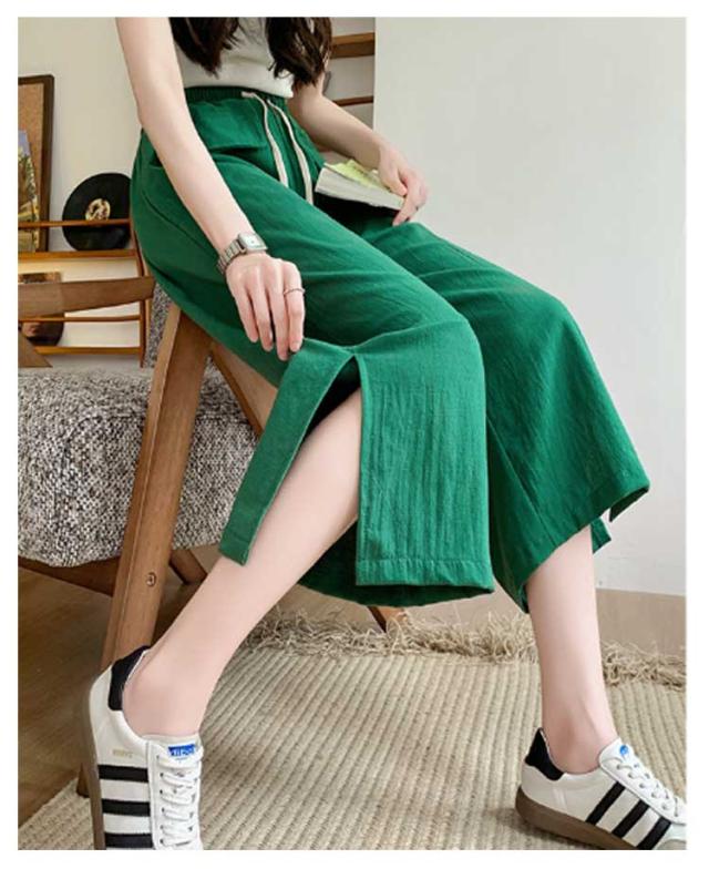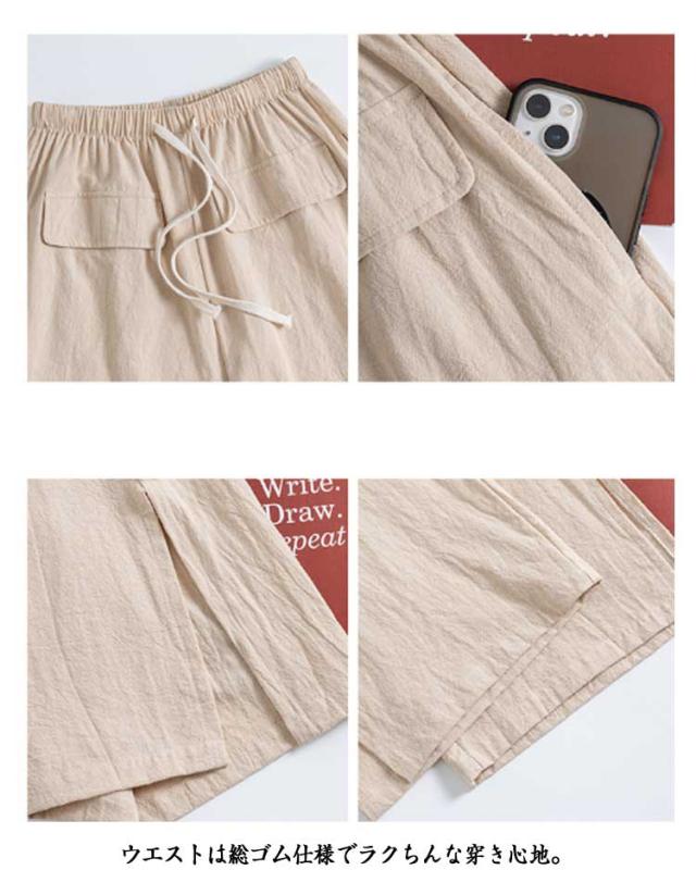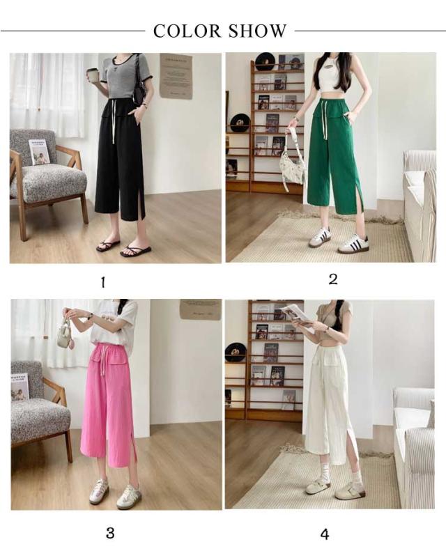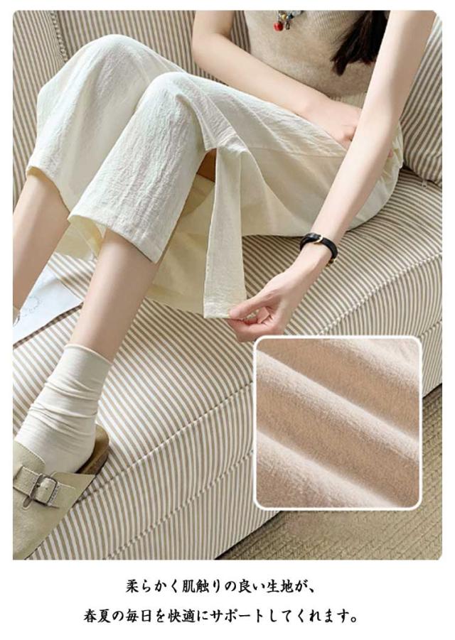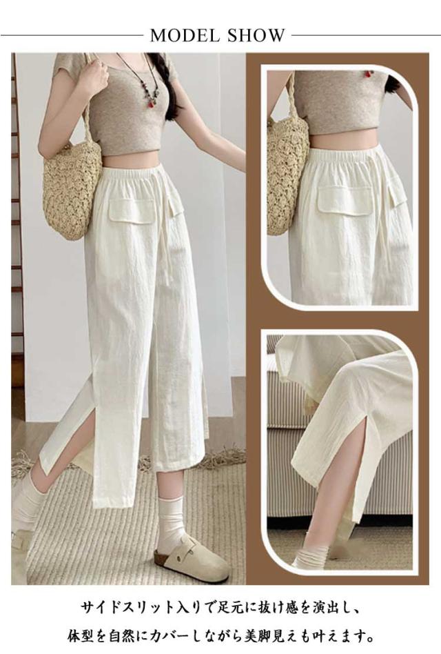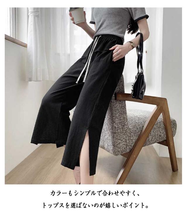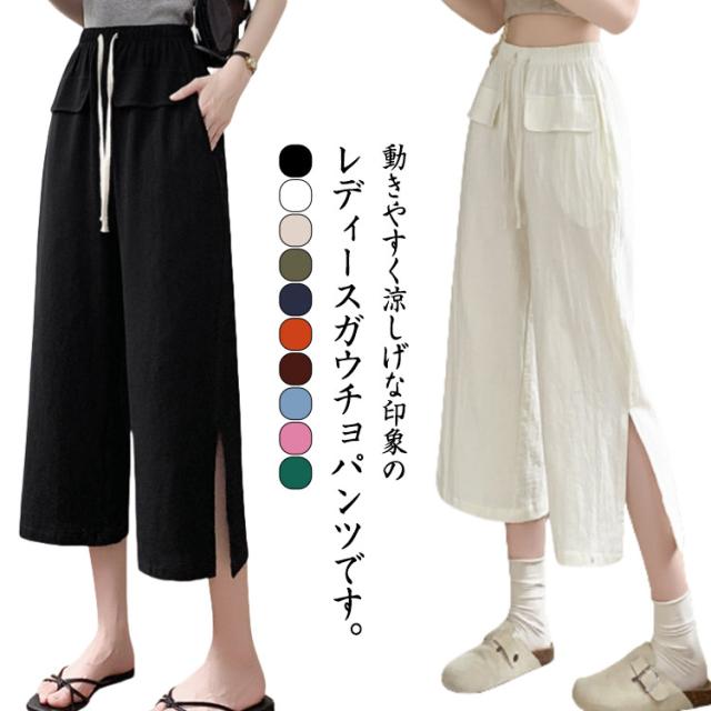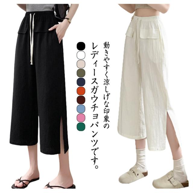 レディース ガウチョパンツ ワイドパンツ クロップドパンツ ボトムス サイドスリット ウェストゴム 7分丈 春夏 無地 シンプル ゆったり お洒落 美脚 柔らかい 体型カバー ポケット付き 送料無料