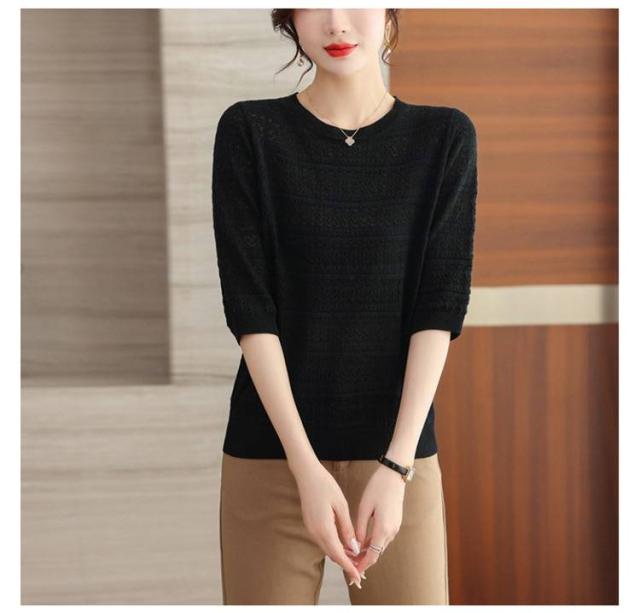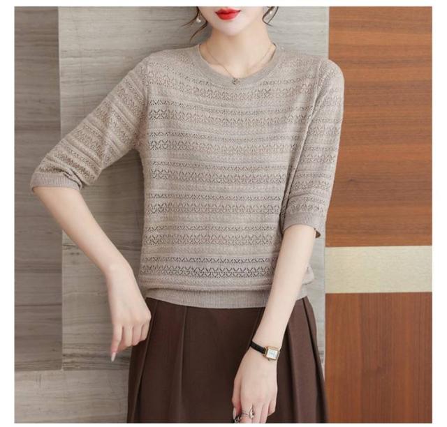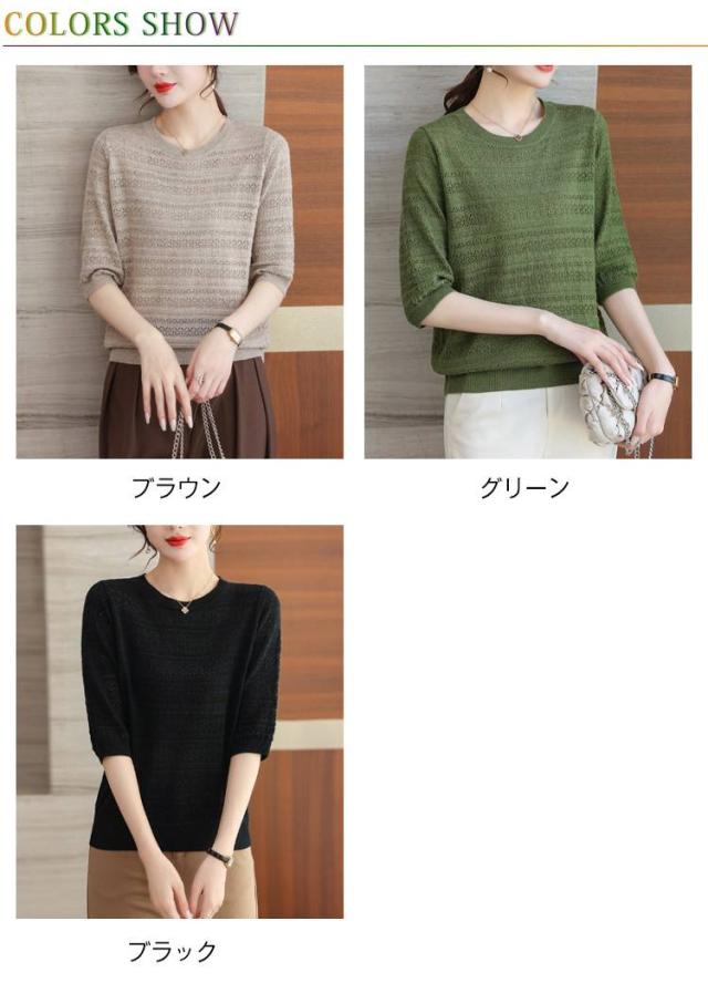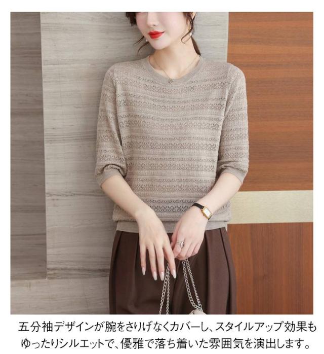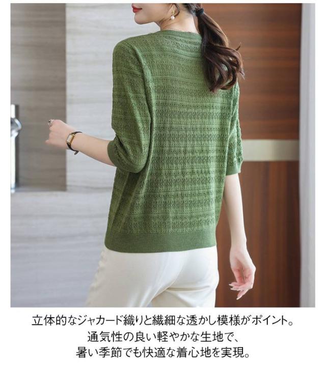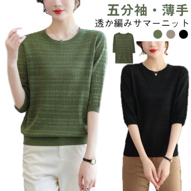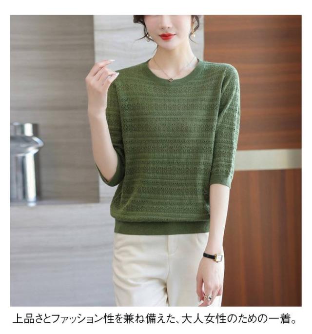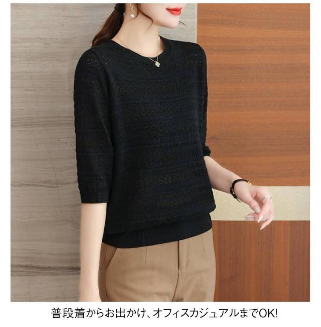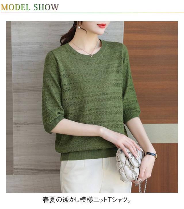 透かし ニットTシャツ レディース 5分袖 tシャツ トップス ラウンドネック ニットソー サマーニット 薄手 夏服 30代 40代 フリーサイズ 春夏 送料無料