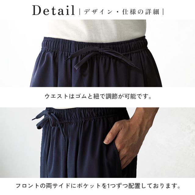 麻のようなさらりと、清涼感のある生地を使用。超ワイドなシルエットも合わさって、軽やかでリラクシーな穿き心地になっております。