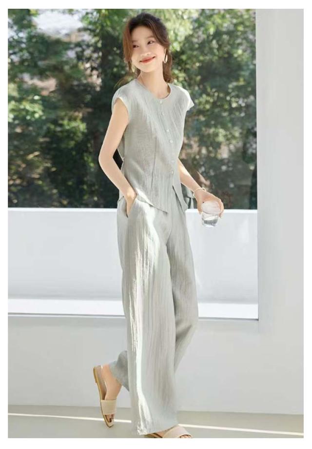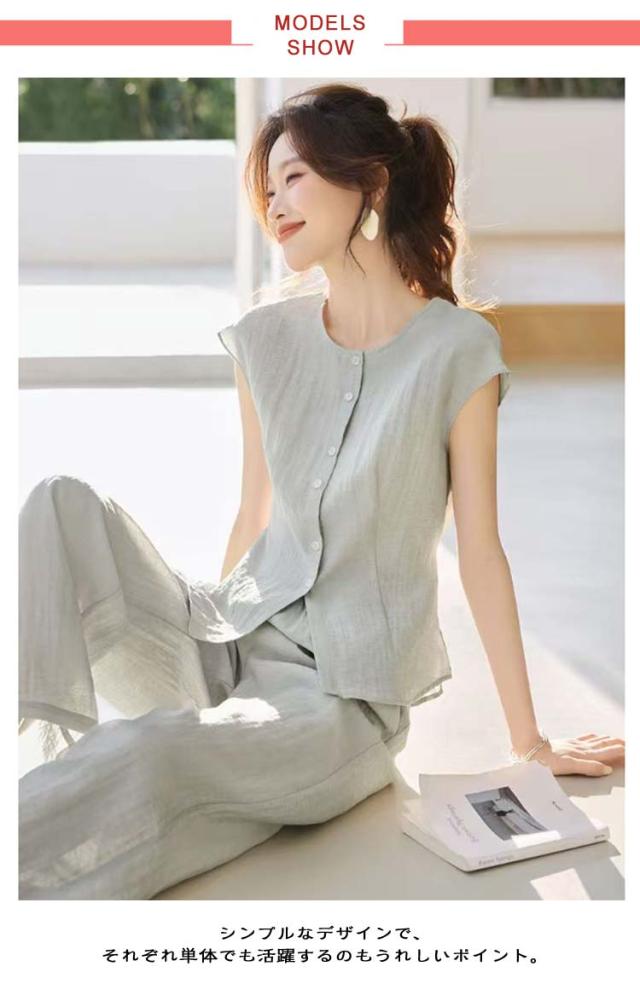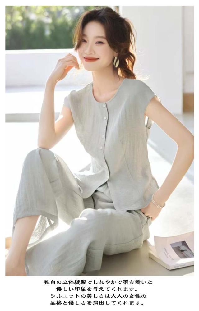 パンツスーツ 夏 40代 セットアップ シャツ ノースリーブ 30代 ガウチョパンツ 事務所 オフィスカジュアル OL 通勤 セットアップ 着痩せ フレンチスリーブ ブラウス ワイドパンツ 夏服 麻調 フォーマル カジュアル