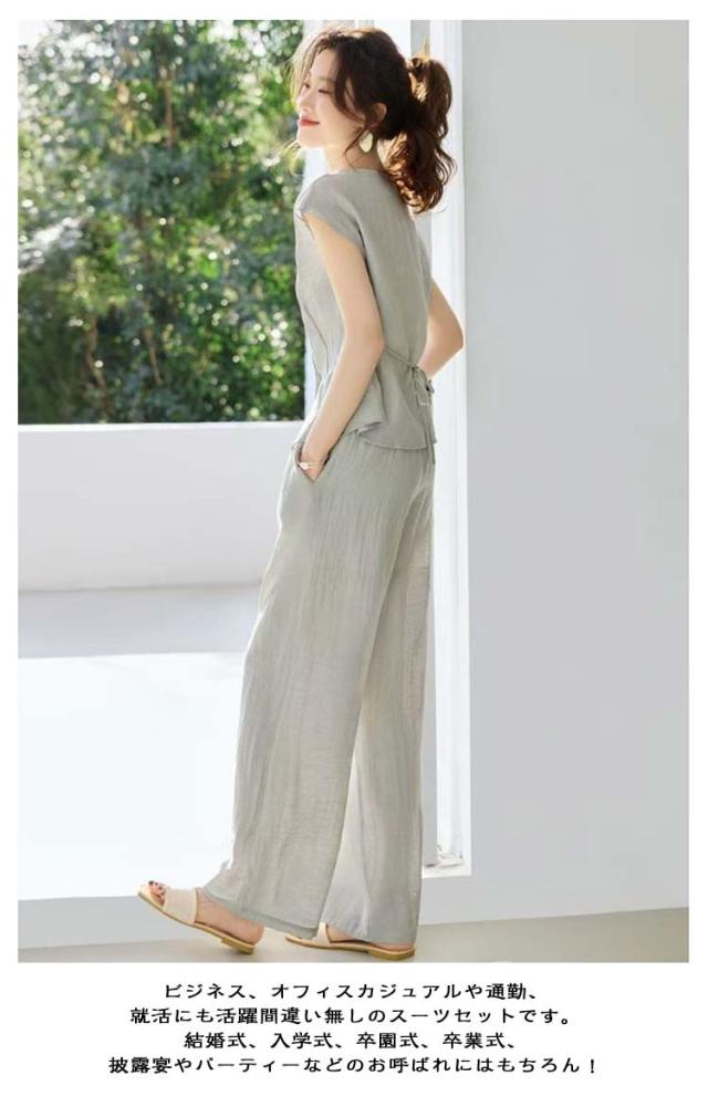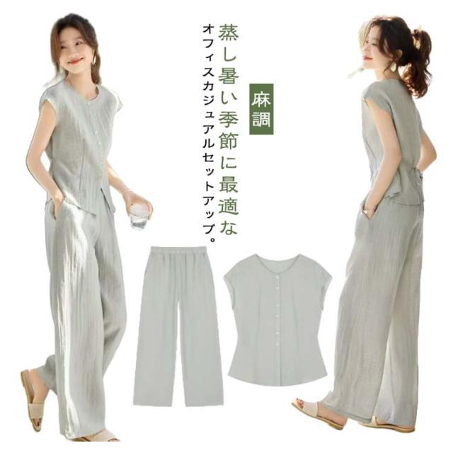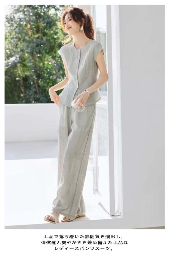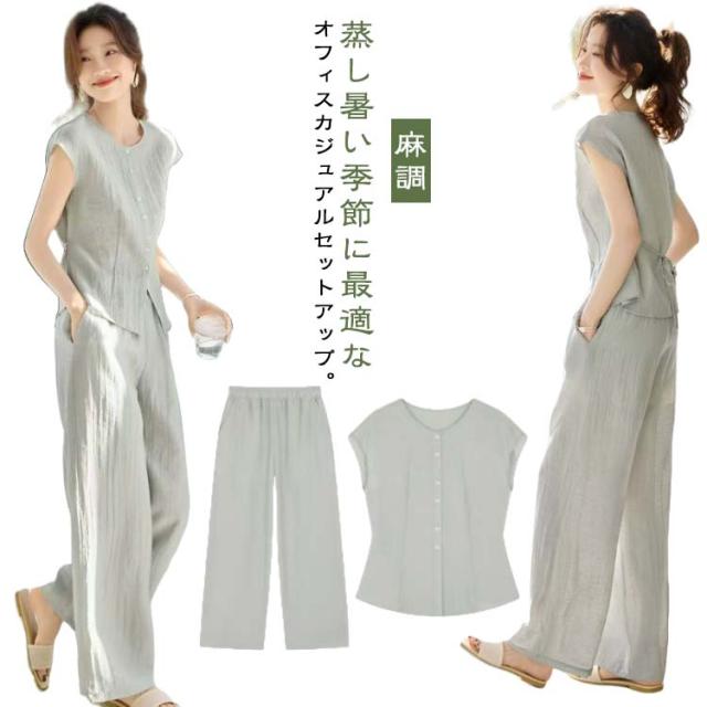 40代 パンツスーツ 夏 オフィスカジュアル OL ノースリーブ シャツ 通勤 セットアップ セットアップ ガウチョパンツ 上下セット 事務所 着痩せ フレンチスリーブ ブラウス ワイドパンツ 夏服 麻調 フォーマル カジュアル