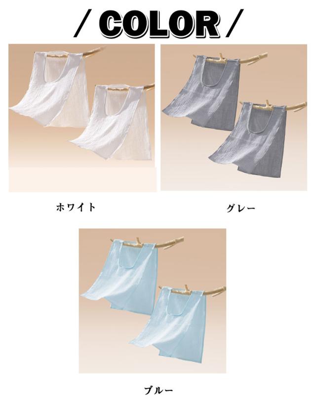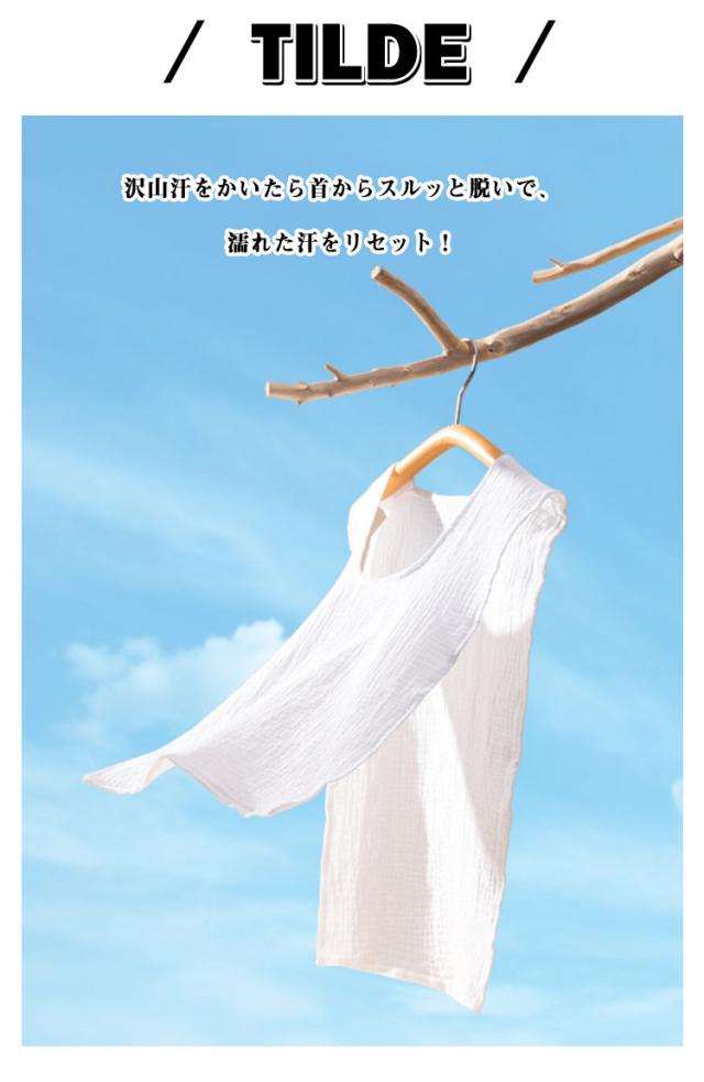 | 【汗取りインナー】 【サッと脱げる!2枚セット】 服を着たままサッと脱げる♪ 沢山汗をかいたら首からスルッと脱いで、濡れた汗をリセット! 吸水力の高い綿のダブルガーゼ、汗をしっかり吸込みます。 ふんわり柔らかい優しいガーゼ生地、着心地も◎ お出かけや通勤通学で背中の汗染みが気になる、汗をかいた後背中が冷たいなど汗で悩まされる様々なシーンに大活躍する汗取りインナーです。 襟開きの大きいUネック、スタイリングに邪魔せずに、スポーツやお出かけ時もお洒落。 | |