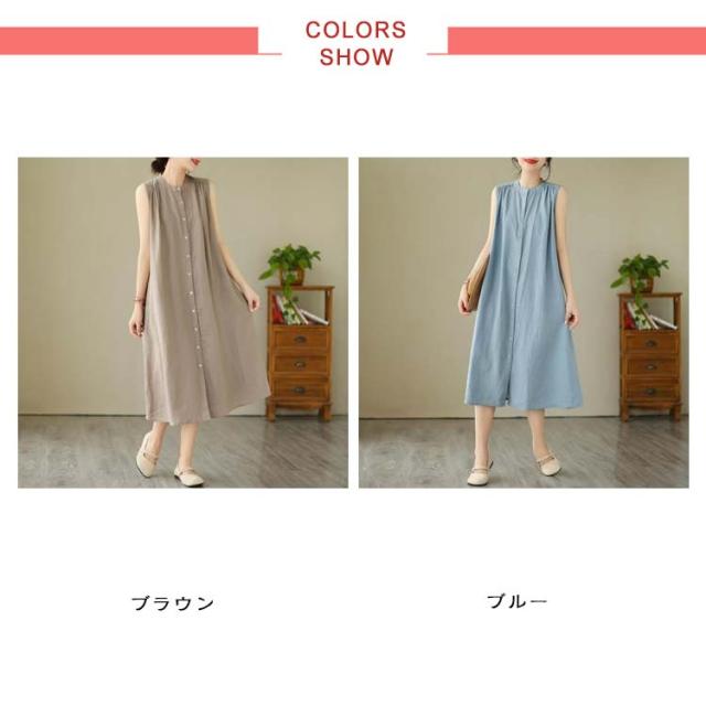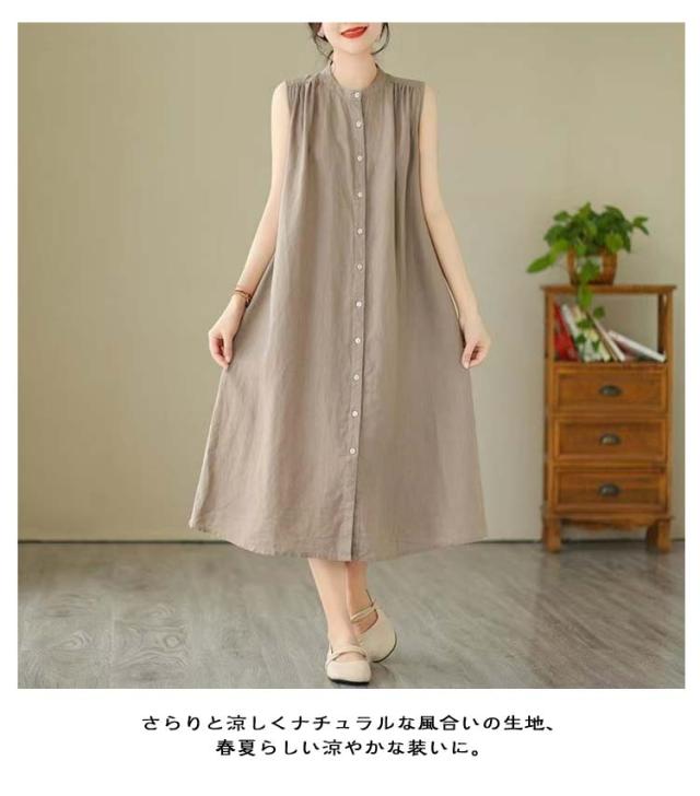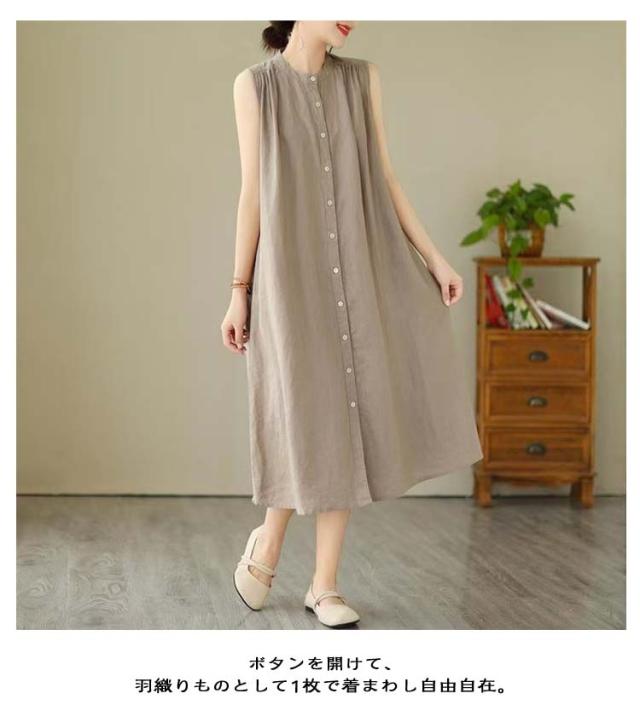 シャツ 袖なし ハンドカラー シャツワンピース ギャザー ロングワンピース ロング 羽織り ミモレ丈 ノースリーブ ギャザー ロングシャツ ワンピース リネン風 ギャザー 綿麻調 春 夏 無地 マタニティ