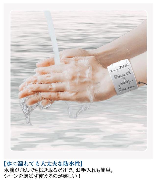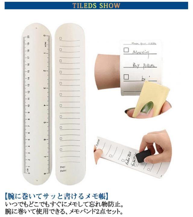 | メモバンド 10点セット 【腕に巻いてサッと書けるメモ帳】 ・いつでもどこでもすぐにメモして忘れ物防止。腕に巻いて使用できる、メモバンド2点セット。 【手軽に身に着けていつも一緒に】 ・パチンと腕に当てて巻きつけ♪腕に目をやることで大切なことを思い出せる、お助けグッズ。 【繰り返し使えるエコアイテム】 ・柔らかなシリコーン製。文字を書きやすく、消しゴムや濡れた指でこすると消える仕様。 【予定を管理できて生活を効率化】 ・TO DO LISTのように使用。完了ステータスにはチェックを入れ頭の中をすっきり整理。 【定規としても仕事などで活躍】 ・裏面はセンチとインチの2つの単位が書かれた定規。設計や現場仕事などでも重宝。 【水に濡れても大丈夫な防水性】 ・水滴が飛んでも拭き取るだけで、お手入れも簡単。シーンを選ばず使えるのが嬉しい! | |